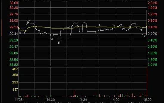 20111123日臨近收盤期間(14:56:2414:59:28),任某某為了在短期內拉升股價,大量申報買入“X”4筆共計63,000股,占尾市階段市場申買量的比例高達75.54%;委托價格由29.60元升至32.00元,每筆均高于當時市場上的買1檔價格,三分鐘內將股價由29.35元拉升至30元收盤,拉升幅度達2.21%。(見下圖)